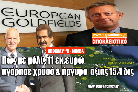 Σύμφωνα με την εφημερίδα Αυγή που είχε ασχοληθεί τότε με το θέμα σε άρθρο της ( http://www.avgi.gr/ArticleActionshow.action?articleID=646845) τα μεταλλεία χρυσού της Χαλκιδικής πουλήθηκαν το 2003 από το «Ελληνικό Δημόσιο» στη εταιρεία "Ελληνικός Χρυσός”έναντι 11 εκατομμυρίων ευρώ. Κατά την Αυγή η εταιρεία "EuropeanGoldfieldshttp://www.egoldfields.com/egoldfields/en/company/overview
